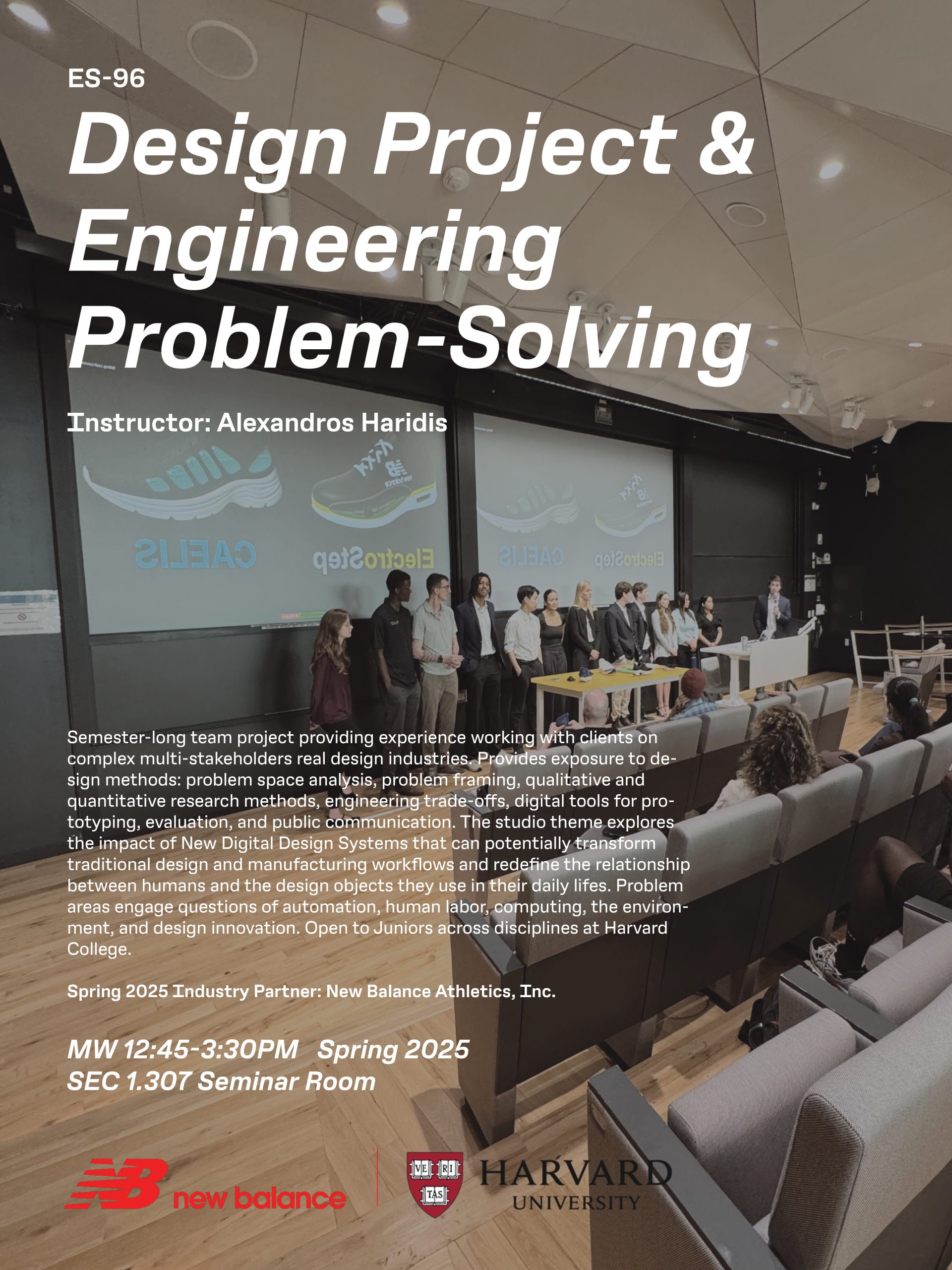 I led a design studio at the Harvard John A. Paulson School of Engineering and Applied Sciences (SEAS) for third-year students at Harvard College pursuing S.B. engineering degrees. The unique aspect of the course is that it couples the studio with a major real-world industry client. In Spring 2025, I pursued a collaboration with New Balance Athletics, Inc., on the contemporary topic of “New Digital Design Systems.” From an educational standpoint, the studio offered a rare opportunity to test a Design Methods approach with an interdisciplinary student body.